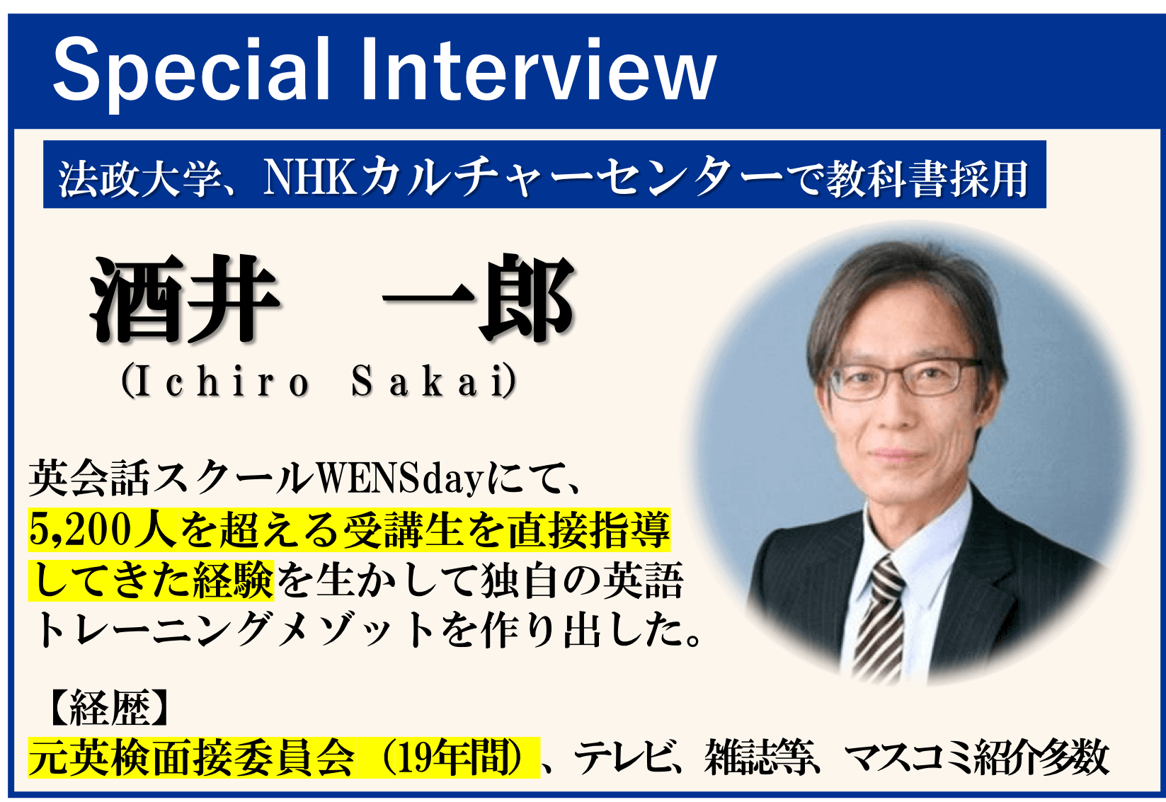 今日は、その「裏ワザ英語学習術」について、テレビや雑誌などのメディアでも多数紹介されている、元英検の面接委員の酒井一郎先生にお話を伺った。